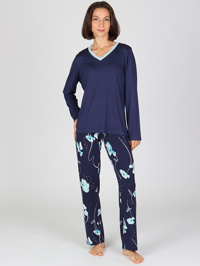 Vrchní díl tvoří triko s květinovým potiskem, které zaujme nejen vzhledem, ale i detaily. Elegantní ozdobná krajka u výstřihu do V dodává pyžamu ženský půvab, zatímco dlouhé rukávy oceníte zejména v chladnějších dnech.