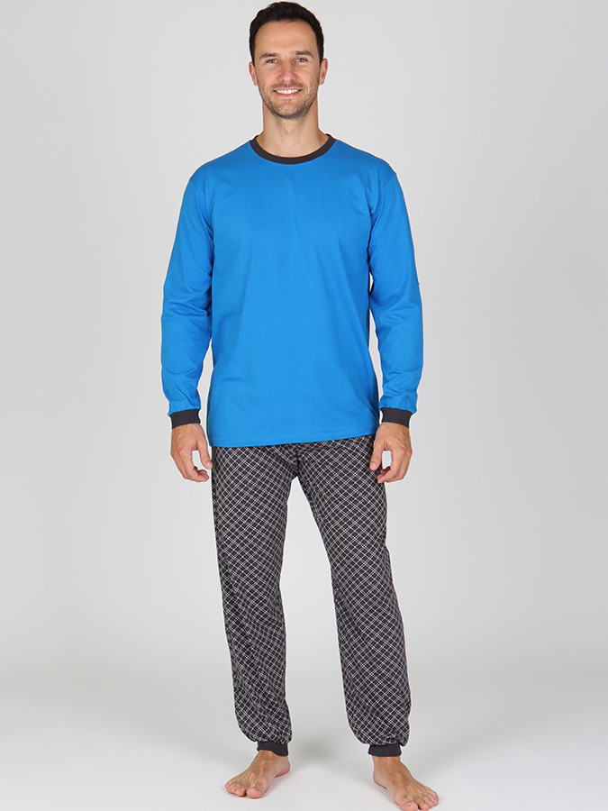 Pohodlné bavlněné pánské dlouhé pyžamo se skládá z jednobarevného trika s dlouhým rukávem a z dlouhých kalhot s celoplošným károvým potiskem.Rukávy a nohavice jsou zakončeny manžetou. ze 100% bavlny, která Vám poskytne příjemný pocit a pohodlí při spánku triko má kulatý výstřih pyžamové kalhoty mají v pase vyměnitelnou elastickou gumu, která zajistí vyšší komfort během nošení