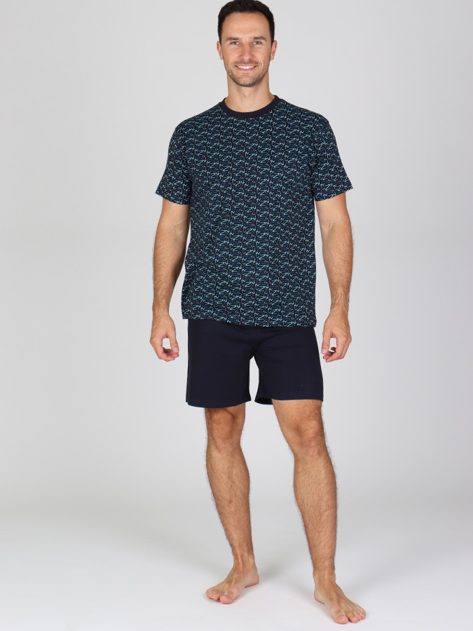Pánské krátké pyžamo P RAVI si na spaní zamilujete. Pohodlné bavlněné pánské krátké pyžamo se skládá z trika s drobným potiskem a krátkých kalhot. Toto pyžamo skvěle poslouží i jako dárek!